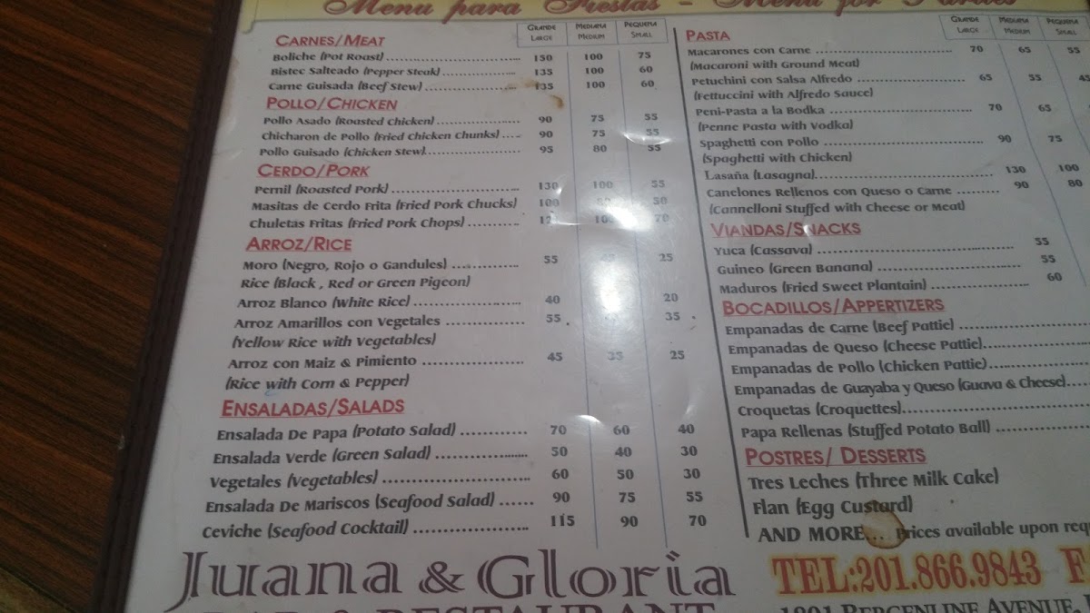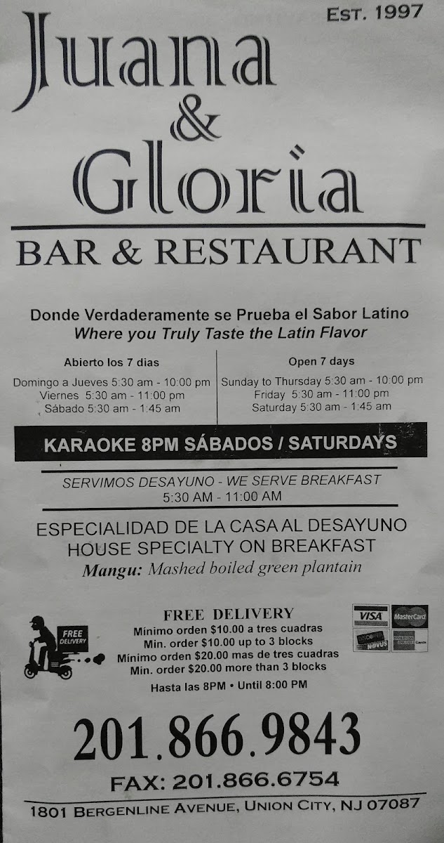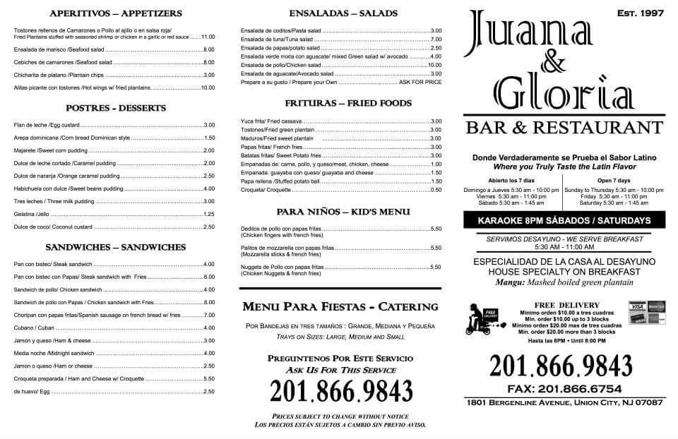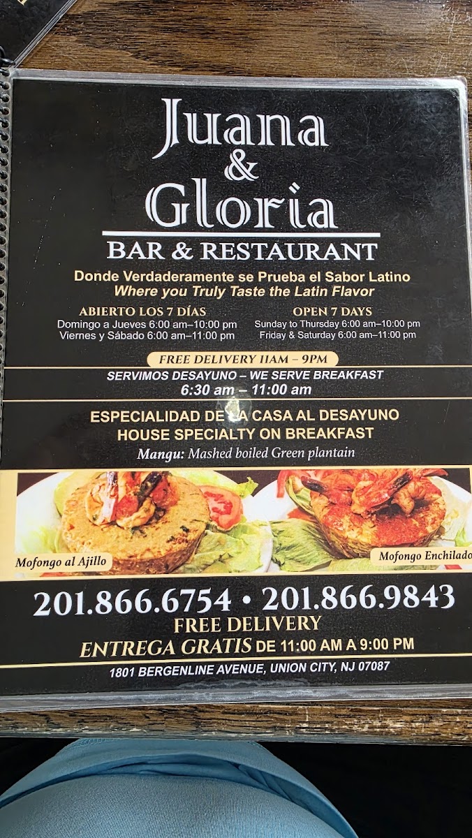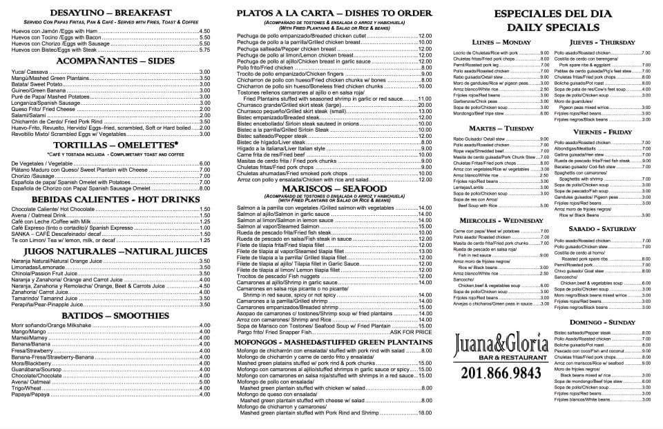 Welcome to Juana & Gloria, a beloved Dominican restaurant nestled in the heart of Union City, NJ. This culinary gem serves a delightful menu that showcases the rich flavors and traditions of Dominican cuisine. Start your day with classic breakfast options like Huevos Con Jamon or Huevos Con Bistec, each bursting with freshness and authenticity. Their Bedidas Calientes range from comforting Hot Chocolate to robust Cafe Con Leche, perfect for pairing with your meal.